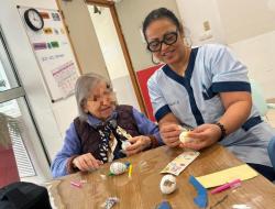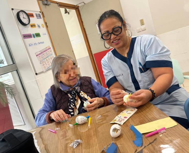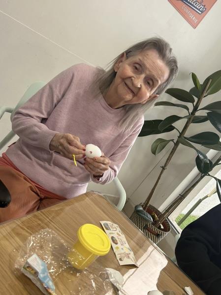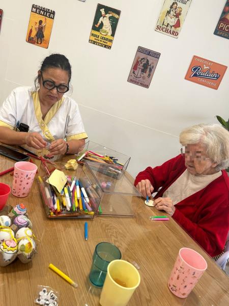 Il y a quelques jours, les soignantes Maguy et Mouniati ont ainsi organisé un atelier créatif autour du thème de Pâques. L’objectif était double : permettre aux résidents de retrouver des repères dans le temps grâce à l’approche des fêtes, tout en apportant une touche colorée et festive à l’unité.