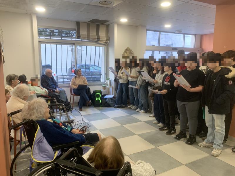 Ses élèves de 3ᵉ se sont rendus à Rivoli afin d’offrir aux résidents un moment musical à travers une chorale. Accompagnés de leurs professeurs, ils ont interprété plusieurs chansons préparées en classe. Les résidents ont accueilli cette représentation avec beaucoup de joie, certains chantant avec les élèves et applaudissant chaleureusement.
