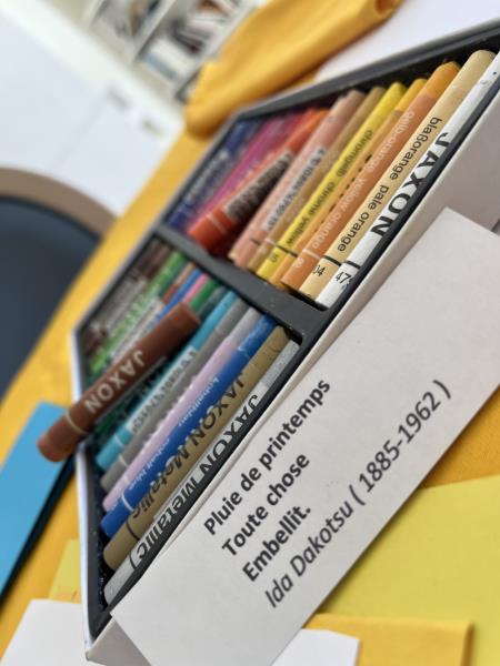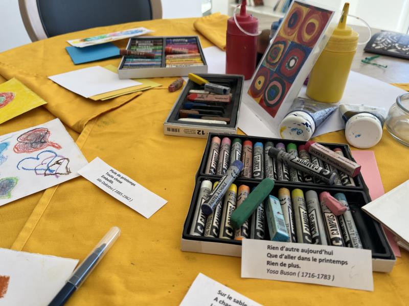 Cette semaine, la séance s’est déroulée dans une ambiance calme et bienveillante, propice aux échanges autour du vécu et des émotions. Les participantes se sont appuyées sur de courts haïkus de printemps, choisis individuellement, comme point de départ à leur création.