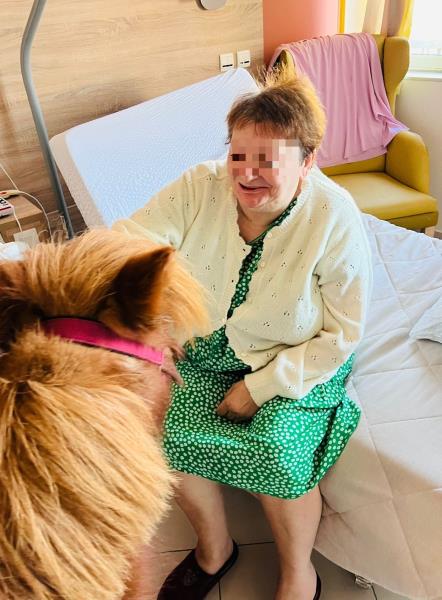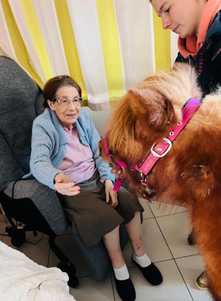 Grâce à sa petite taille et à son tempérament particulièrement calme, Fripon a pu rendre visite à chacun de nos résidents, qu'ils soient dans le confort de leur chambre ou dans les espaces communs. Tous ont ainsi pu le voir, lui parler et le caresser, créant un véritable moment de proximité et d’émotion.
